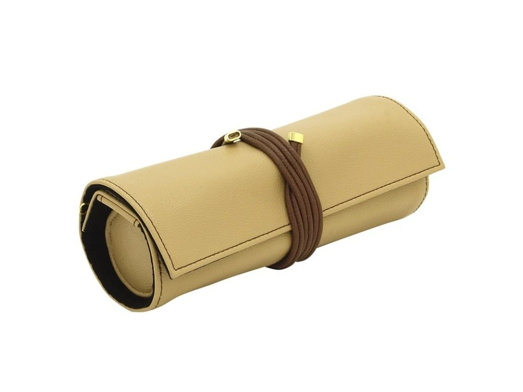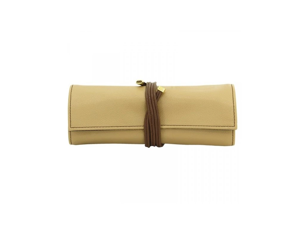 Cestovní pouzdro ve béžové barvě s černým interiérem, 2x kapsa na zip, malý vak na zip, polštář na prstýnky, pásek pro pověšení náušnic.