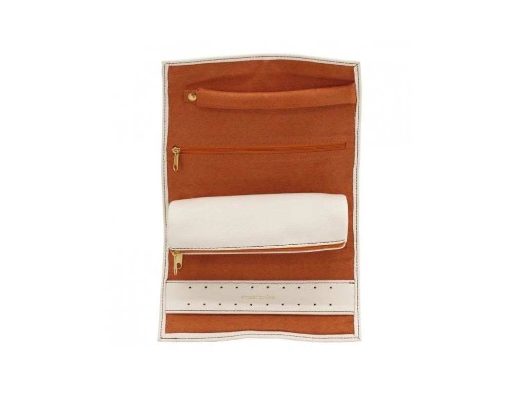Cestovní pouzdro ve slonovinové barvě s oranžovým interiérem, 2x kapsa na zip, malý vak na zip, polštář na prstýnky, pásek pro pověšení náušnic.