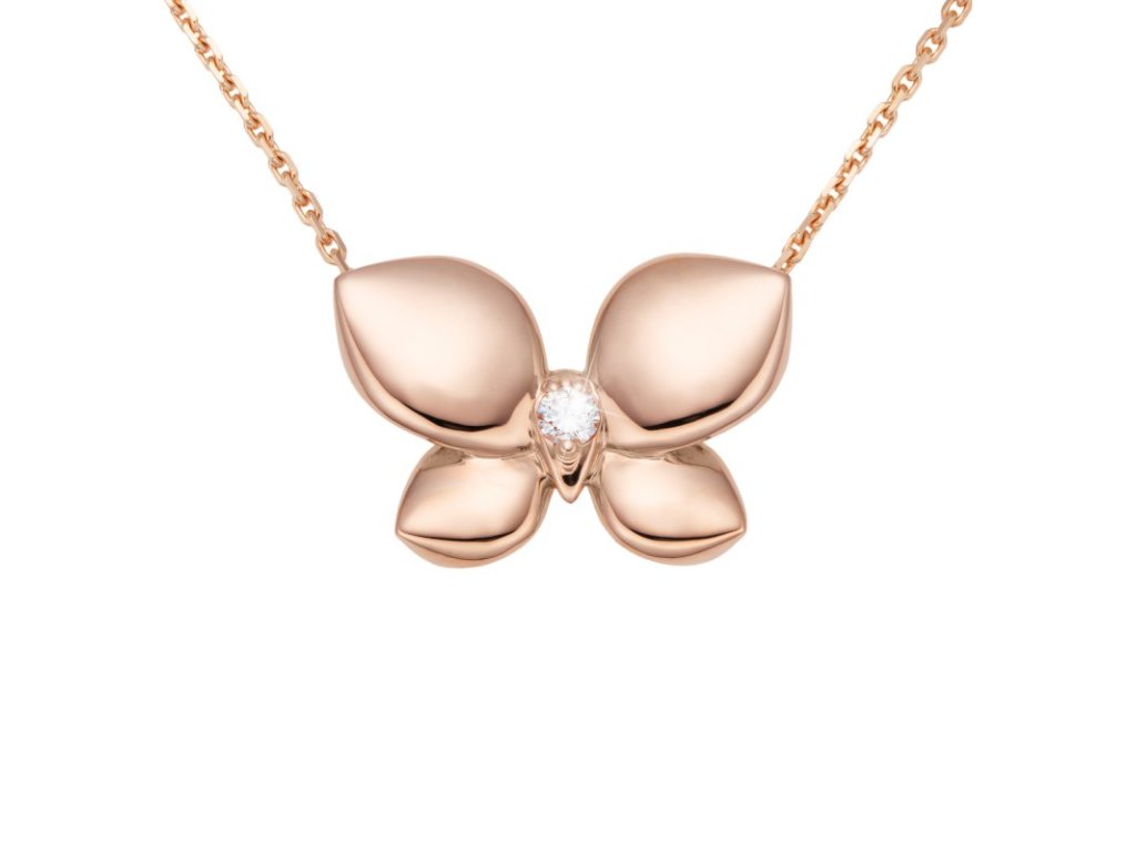 Náhrdelník z růžového 14karátového zlata z limitované edice, vytvořený ve spolupráci s Ivetou Fabešovou, vyniká jemným a moderním designem. Motiv motýla je tvarovaný do ladných, měkce modelovaných linií, které působí ženským a harmonickým dojmem.