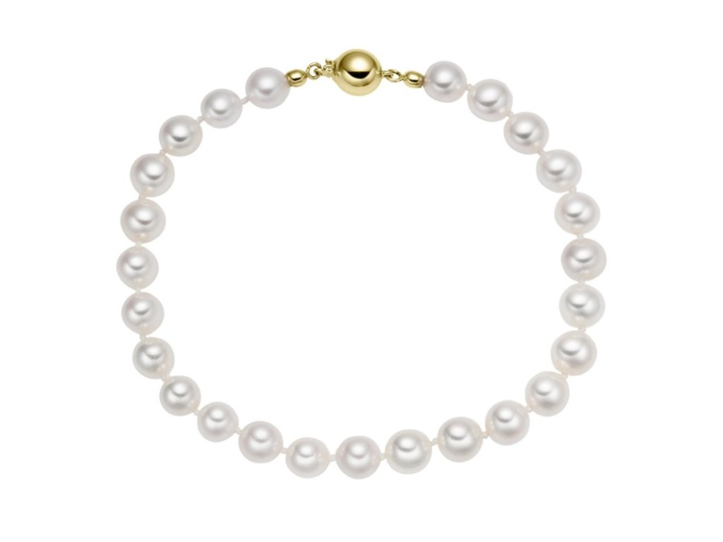 Perlový náramek tvoří mořské perly akoya, které jsou proslulé svým zrcadlovým leskem, dokonale kulatým tvarem a jemnými tóny bílé s růžovým či stříbrným nádechem. Náramek doplňuje elegantní zapínání ze žlutého 14karátového zlata.