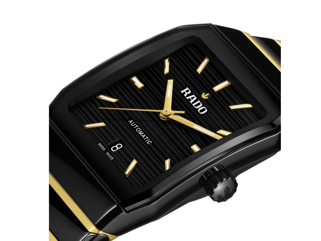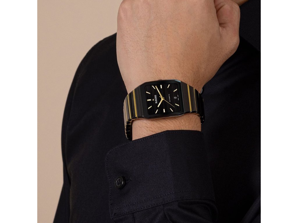 Rado Anatom Automatic R10200152 jsou luxusní unisex hodinky v elegantním stylu na bicolor náramku z keramiky a oceli s PVD úpravou ve zlaté barvě a s motýlkovou sponou. Černé keramické pouzdro o šířce 32,5 milimetru je vyrobeno z odolného materiálu Plasma High-Tech Ceramic, díky kterému jsou hodinky lehké, hypoalergenní a odolné vůči poškrábání. Průhledné zadní dýnko z nerezové oceli a sklíčka umožňuje sledovat chod strojku. Černý číselník s drážkami a ukazatelem data na pozici 6. hodiny je chráněn cylindrickým safírovým sklem s antireflexní vrstvou na vnitřní straně. Ručičky a indexy jsou pokryty luminiscenčním nátěrem Super-LumiNova®, který garantuje perfektní čitelnost za zhoršených světelných podmínek. Pohon hodinek zajišťuje mechanický strojek R766 (03.766.732) s automatickým nátahem a rezervou chodu 72 hodin. Tento strojek s funkcí zastavení vteřinové ručky při vytažení korunky do krajní polohy, pro kterou se vžilo označení hacking, je možné v případě potřeby natahovat i ručně. Díky použití antimagnetického vlásku setrvačky Nivachron™ je tento kalibr vysoce odolný vůči vlivům magnetického pole. Vodotěsnost hodinek činí 5 ATM a jsou tedy odolné proti dešti a při sprchování.
