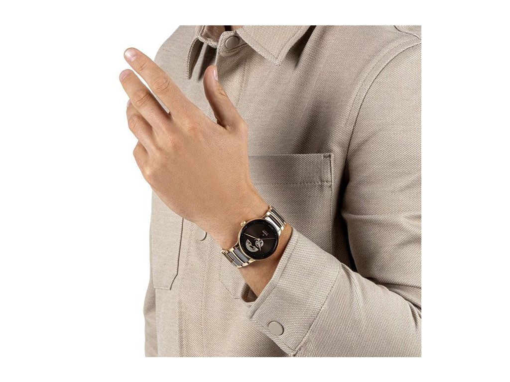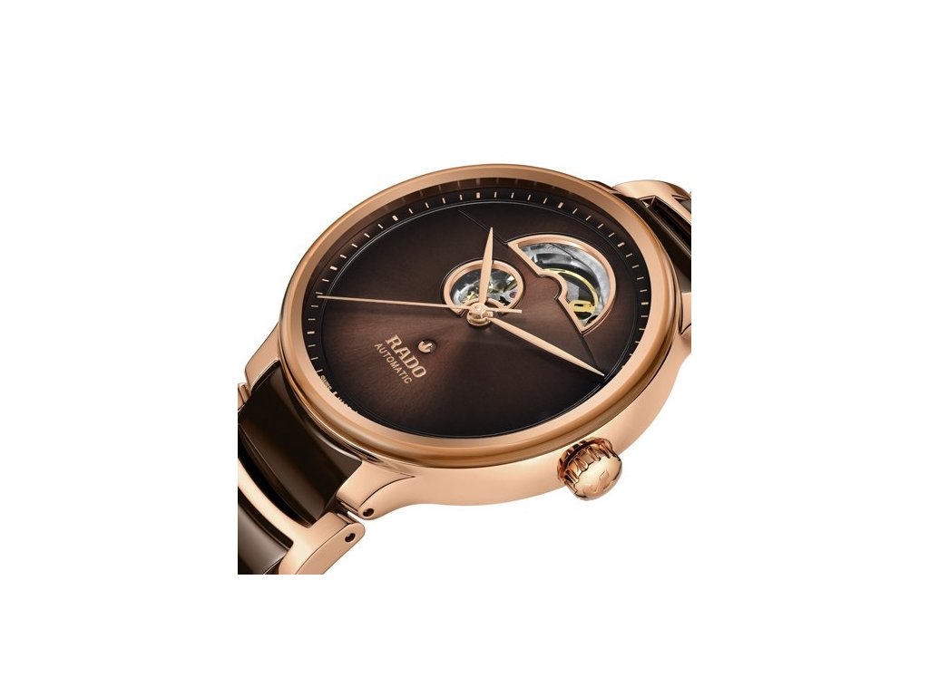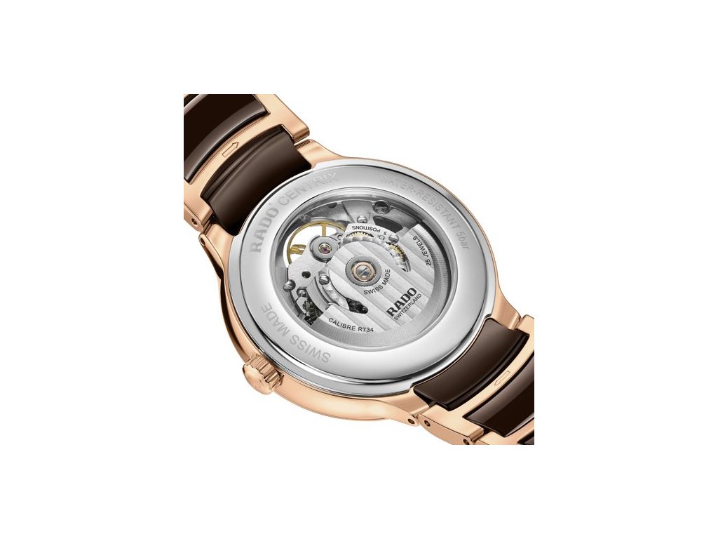 Rado Centrix Automatic Open Heart R30013302 jsou automatické unisex hodinky elegantního stylu s nerezovým pouzdrem o průměru 39,5 milimetru. Náramek tvoří kombinace keramického materiálu High-Tech Ceramic a oceli. Pouzdro s korunkou a ocelové části náramku jsou ošetřeny PVD úpravou v barvě růžového zlata. Hnědý číselník s efektem slunečního brusu nabízí díky komplikaci open heart pohled do samotného srdce mechanického stroje. Číselník chrání safírové sklíčko s oboustrannou antireflexní vrstvou a metalizovaným okrajem, které sahá až k úplnému okraji pouzdra. Průhledné dýnko umožňuje pohled na automatický kalibr, který je dekorovaný perláží a ženevskými pruhy. Tento mechanický strojek s automatickým nátahem a rezervou chodu 80 hodin disponuje funkcí hackingu (zastavení vteřinové ručky při vytažení korunky do krajní polohy) a je možné ho v případě potřeby natahovat i ručně. Díky použití antimagnetického vlásku setrvačky Nivachron™ z titanové slitiny je tento kalibr vysoce odolný vůči vlivům magnetického pole. Pro dosažení co nejvyšší možné přesnosti je stroj testován v pěti pozicích. Hodinky disponují vodotěsností 5 ATM a jsou tedy odolné proti dešti a při sprchování.