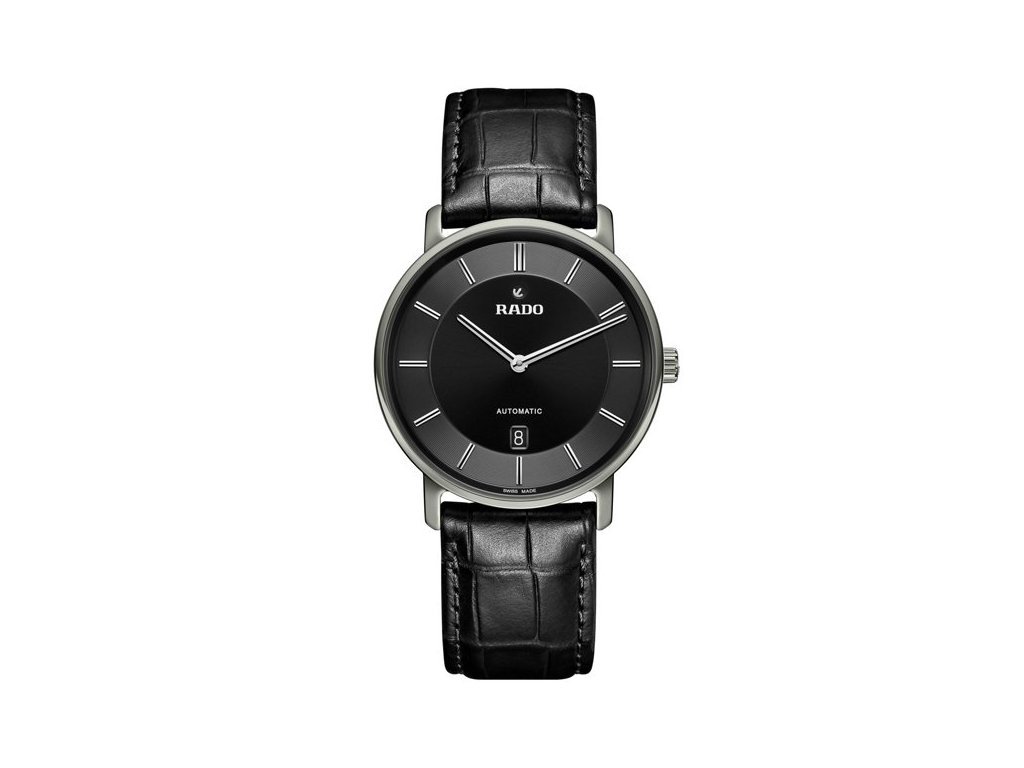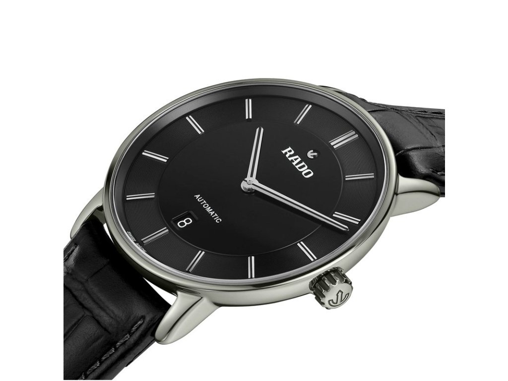Rado DiaMaster Thinline Automatic R14067166 jsou pánské automatické hodinky v elegantním stylu s černým koženým řemínkem a průměrem pouzdra 40,3 milimetru. Pouzdro je ze speciálního kompozitního materiálu Ceramos™, který je velmi odolný proti poškrábání. Černý číselník s datumovkou zdobí soustředné kruhy po jeho obvodu a je chráněn safírovým sklem s oboustrannou antireflexní vrstvou pro co nejlepší možnou čitelnost. Průhledné dýnko umožňuje pohled na stroj dekorovaný perláží a ženevskými pruhy. Tento mechanický strojek R766 (03.766.111) s automatickým nátahem a rezervou chodu 72 hodin disponuje funkcí hackingu (zastavení vteřinové ručky při vytažení korunky do krajní polohy) a je možné ho v případě potřeby natahovat i ručně. Díky použití antimagnetického vlásku setrvačky Nivachron™ z titanové slitiny je tento kalibr vysoce odolný vůči vlivům magnetického pole.