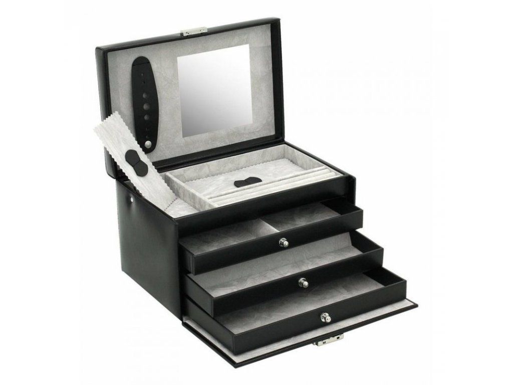 Šperkovnice ze syntetické kůže, černá barva se světle šedým interiérem, 4 patra na uložení šperků, zrcátko ve víku šperkovnice.