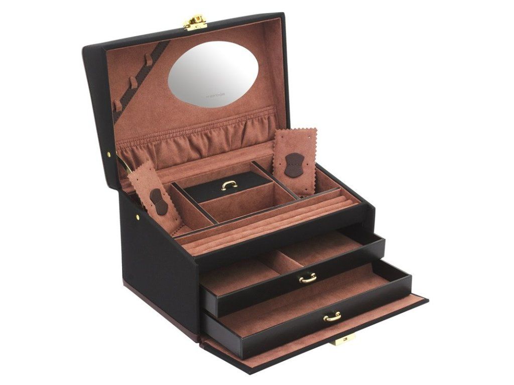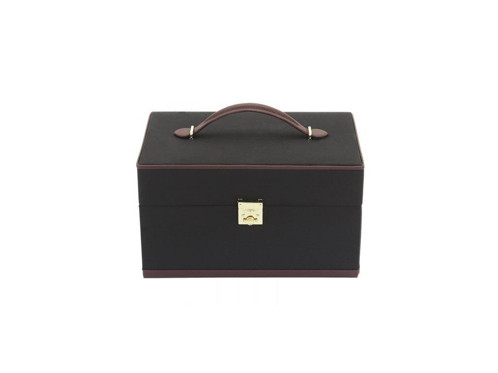 Černá šperkovnice z polyesteru s hnědým interiérem z mikrofáze, zrcátko ve víku.