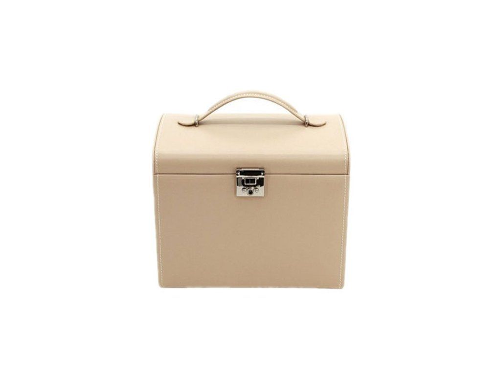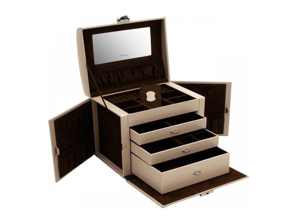 Kožená šperkovnice v béžové barvě s hnědým interiérem. Otevírací boční strany pro uložení dalších šperků, 4 patra s různým rozložením a zrcátko ve víku.