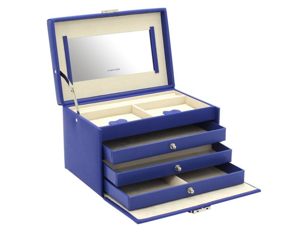 Šperkovnice ze syntetické modré kůže, vzor příčných vláken, vnitřní materiál velur v béžové barvě, uzamykatelná. 4 patra pro uložení šperků, zrcadlo na víku.