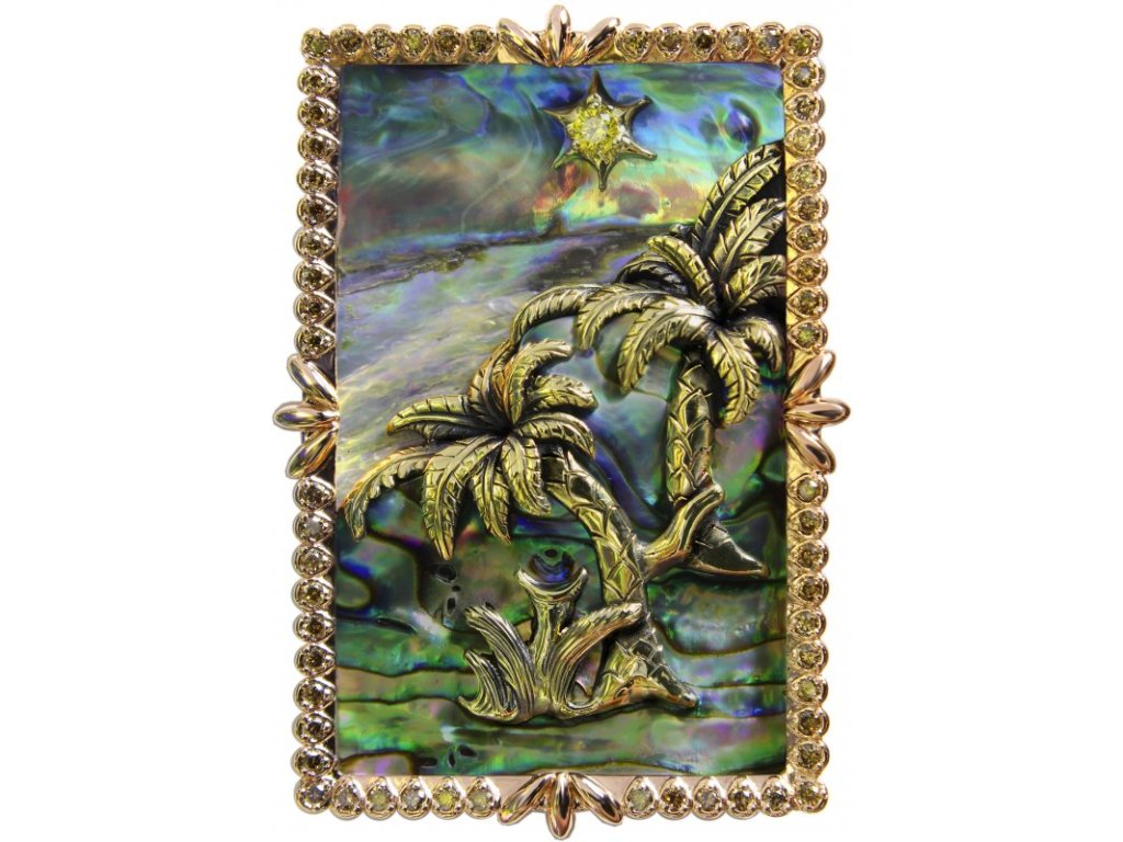 Originální brož ze žlutého a růžového 14karátového zlata je skutečným uměleckým dílem. Jemná perleť s proměnlivými odlesky vytváří dokonalé pozadí pro motiv zlatých palem, zatímco žluté a champagne brilianty vsazené do rámu dodávají šperku oslnivý třpyt.