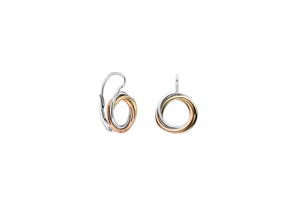 Náušnice ze 14karátového zlata tvoří trojice navzájem propletených kroužků v odstínech bílého, žlutého a růžového zlata. Hladké, lesklé kroužky se do sebe jemně vplétají a na uchu vytvářejí něžný motiv malého zlatého uzlíku, který krásně zachytává světlo při každém pohybu.