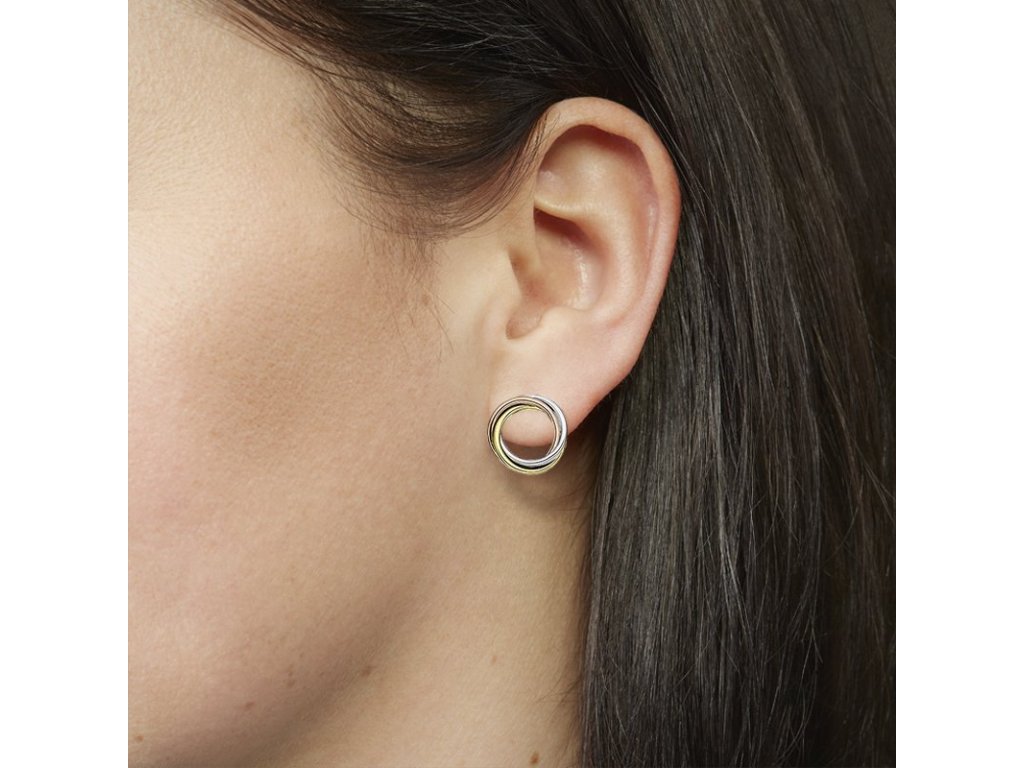 Náušnice tvoří tři kroužky ze žlutého, bílého a růžového 14karátového zlata, které se elegantně proplétají do jednoho motivu. Hra tří odstínů zlata vytváří zrcadlový lesk, který nechává vyniknout každému detailu.