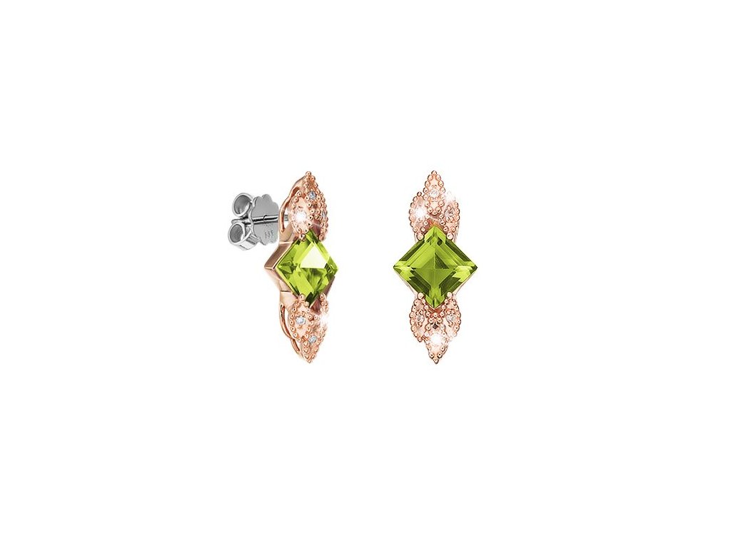 Náušnice z růžového a bílého 14karátového zlata v elegantním podélném provedení zdobí nádherný přírodní zelený peridot. Zářivé přírodní diamanty obklopené jemnými zlatými kuličkami dodávají šperku třpyt, který zaujme na první pohled.