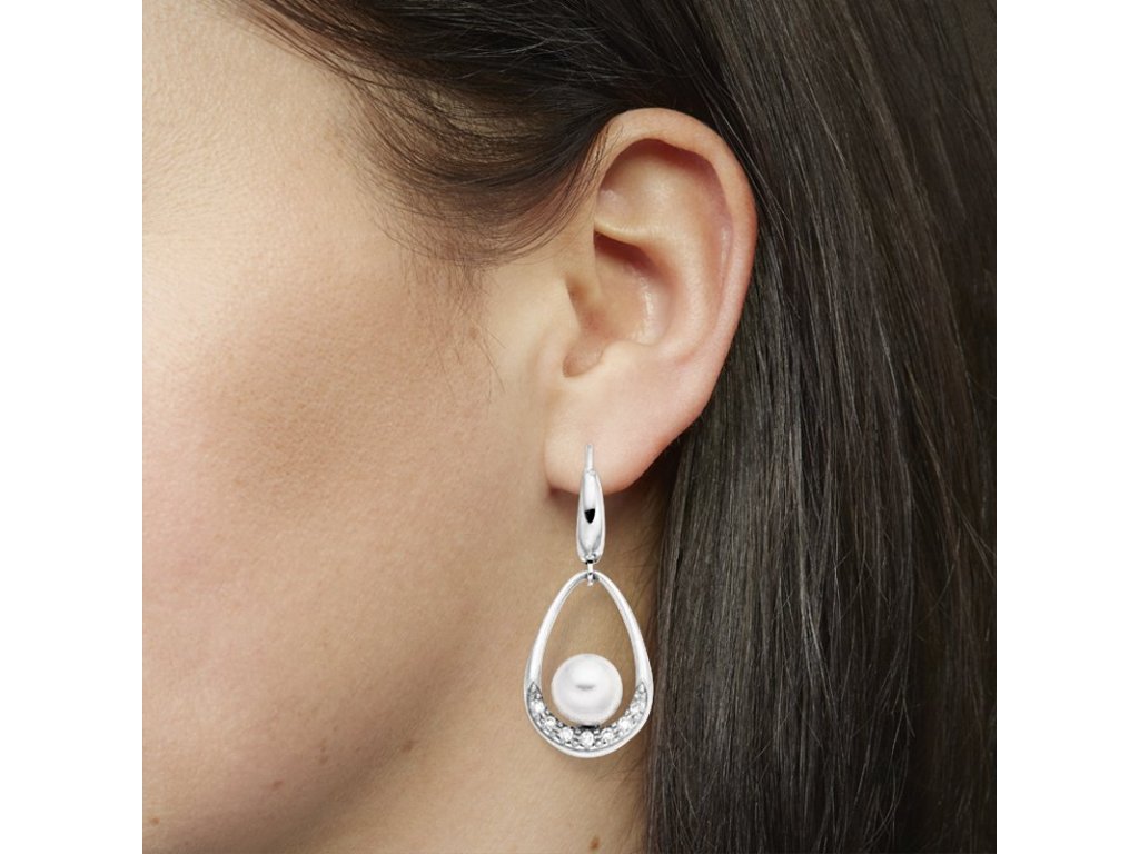 Visací náušnice z bílého 14karátového zlata se sladkovodní perlou a přírodními diamanty spojují jemnost a luxus v jednom šperku. Třpyt diamantů krásně kontrastuje s hedvábným leskem perly, čímž vytváří nadčasový symbol elegance a ženskosti.