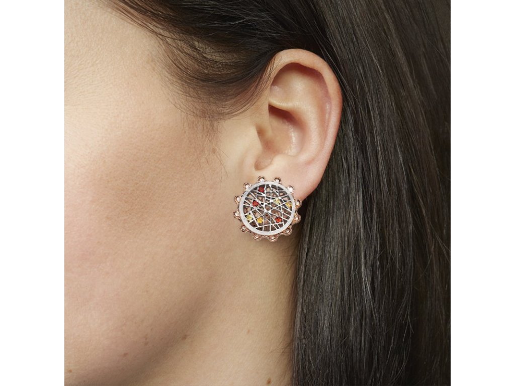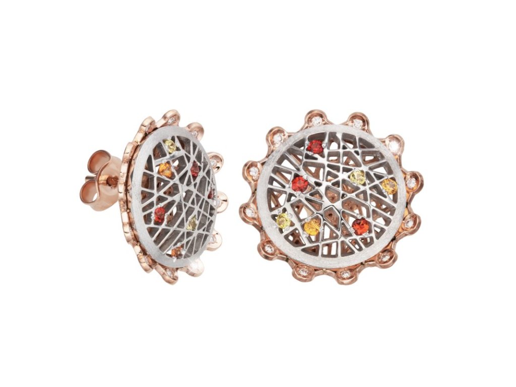 Zlaté náušnice z růžového a bílého 14karátového zlata vynikají originálním designem, který připomíná vitráž s pestrou hrou barevných kamenů. Kombinace bílého a růžového zlata vytváří sofistikovaný kontrast, zatímco přírodní diamanty a safíry v teplých odstínech dodávají šperku jiskru a hloubku. Elegantní volba pro ženy, které hledají jedinečný šperk s uměleckým nádechem.
