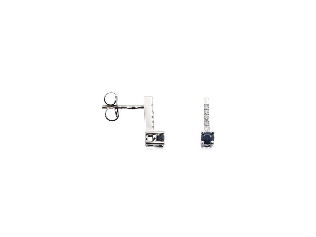 Náušnice z bílého 14karátového zlata s přírodními diamanty a přírodním safírem. Svislá linie čirých diamantů plynule přechází v modrý safír, jehož hluboký odstín krásně kontrastuje s třpytem diamantů.