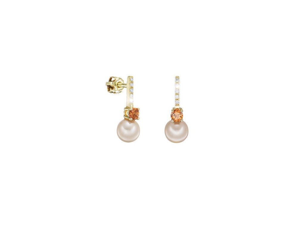 Zlaté náušnice s přírodními růžovými perlami, mandaríny a diamanty