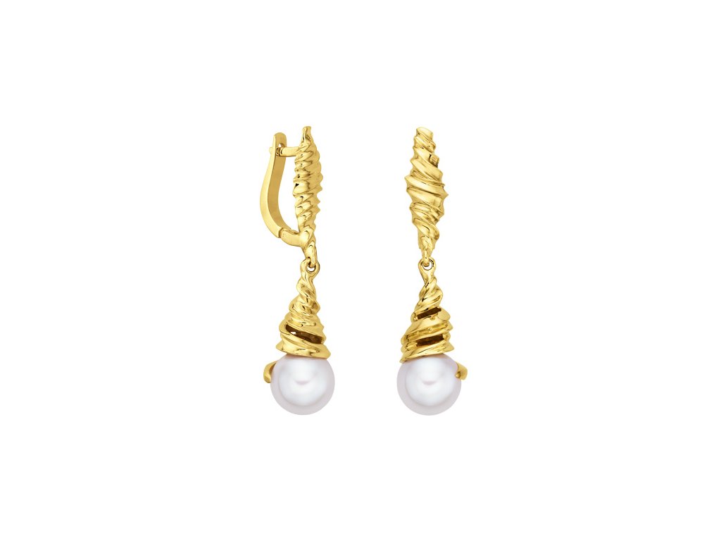 Visací náušnice ze žlutého 18karátového zlata připomínají malou lasturu, která v sobě ukrývá přírodní perlu.
