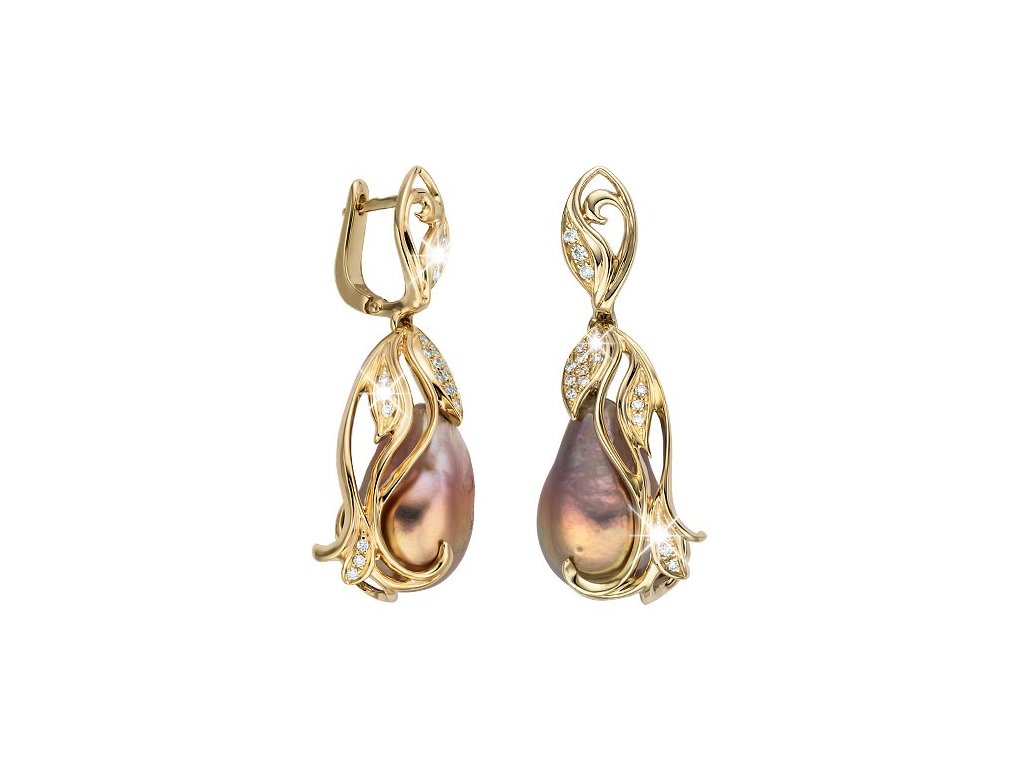 Noblesní náušnice ze žlutého 14karátového zlata, jehož jemně propletený design připomíná organické linie přírody, jsou ručně osazeny třpytivými přírodními brilianty. Dominantou visacích náušnic je perla Biwa s nádhernými odstíny růžové a fialové, která svým proměnlivým leskem vyvolává dojem magického světla.