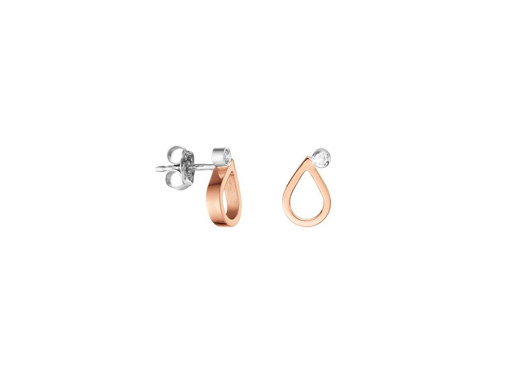 Náušnice z 14karátového růžového a bílého zlata mají tvar obrysu kapky, který působí lehce a elegantně. V horní části je zasazen diamant v hladké obrubě, jehož velikost harmonicky doplňuje celkový design a dodává náušnicím výrazný třpyt i vyvážený vzhled. Díky své kombinaci barev a čistému tvaru náušnice zaujmou jak při každodenním nošení, tak i při významné schůzce.