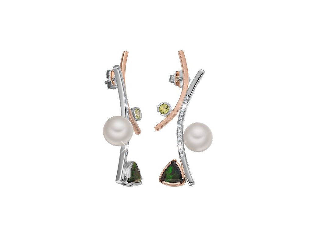 Náušnice z bílého a růžového 14karátového zlata jsou oslavou ženské krásy v celé její rozmanitosti. Bílá sladkovodní perla dodává jemnost a eleganci, peridot svěžest a energii, africký opál zase tajemství a hloubku. Přírodní diamanty zachytí při každém pohybu světlo a rozzáří šperk neodolatelným třpytem. Výsledkem je klenot, který vyzařuje harmonii, noblesu a osobitý charakter.