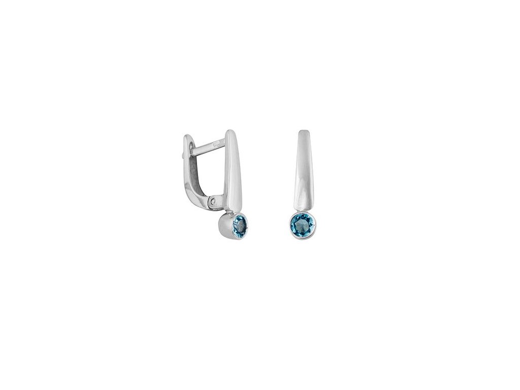 Elegantní náušnice z bílého 14karátového zlata zdobí přírodní topazy Swiss, drahokamy oblíbené pro svou jasně modrou, křišťálově čistou barvu. V dopadajícím světle se modrá barva krásně projasňuje a dodává šperku výjimečnou hloubku.