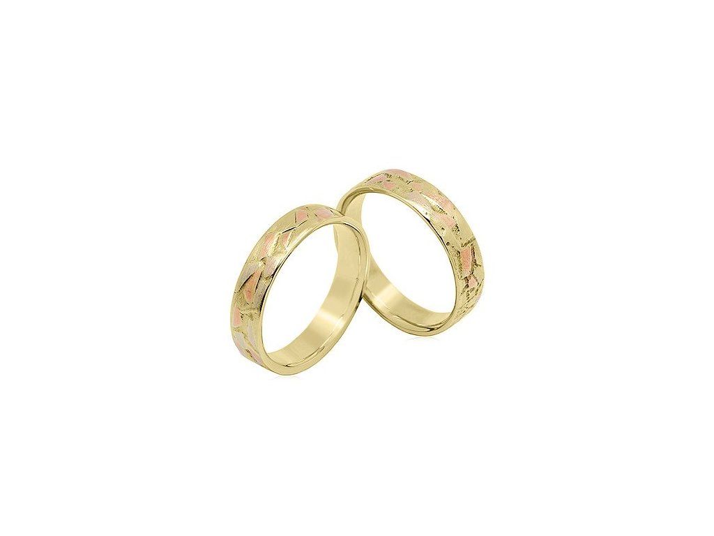 Snubní prsteny z bílého, žlutého a růžového 14karátového zlata zaujmou na první pohled svým dekorativním povrchem, který připomíná jemnou mozaiku či strukturu inspirovanou přírodou. Nepravidelný vzor vytváří zajímavou hru světla a dodává prstenům zajímavý plastický efekt.