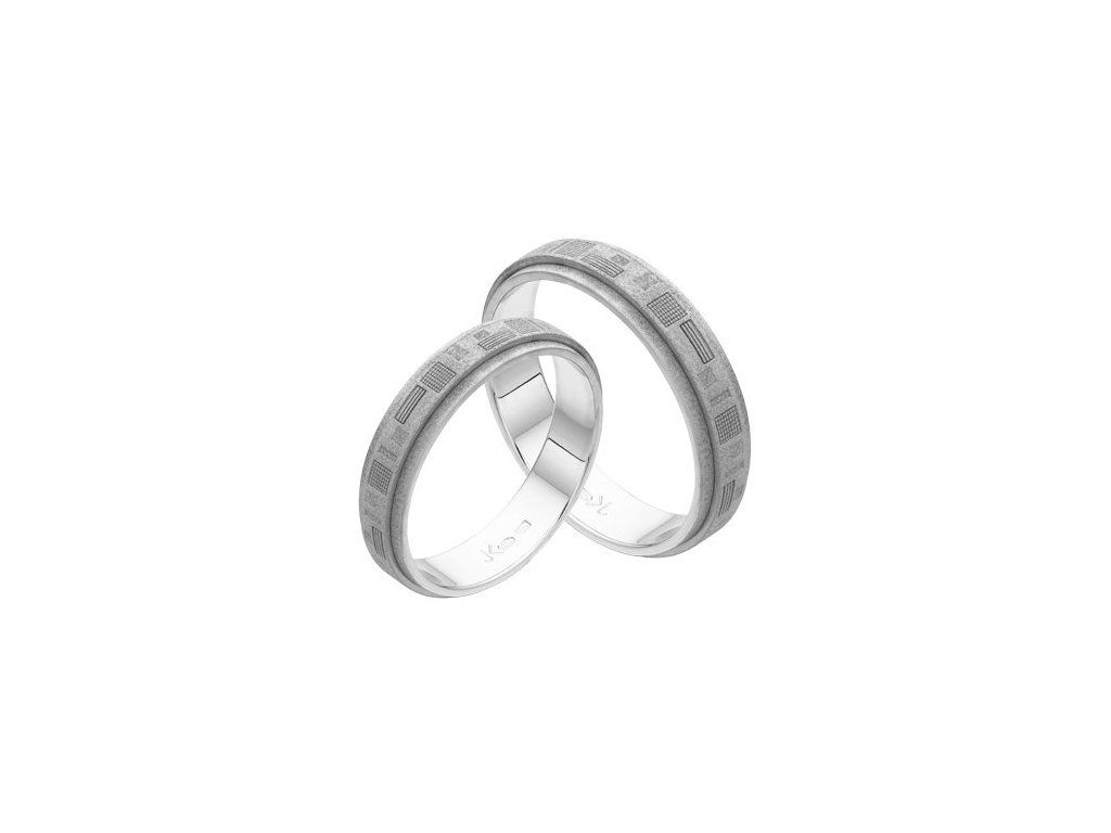 Snubní prsteny z bílého 14karátového zlata s originálním vzorem industrial. Jemná matovaná povrchová úprava propůjčuje prstenům lehce surový charakter a zvýrazňuje jejich strukturu. Navíc postupem času přirozeně získávají jedinečnou patinu, která podtrhuje jejich hloubku a autentický vzhled.