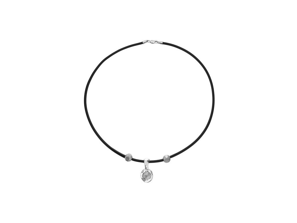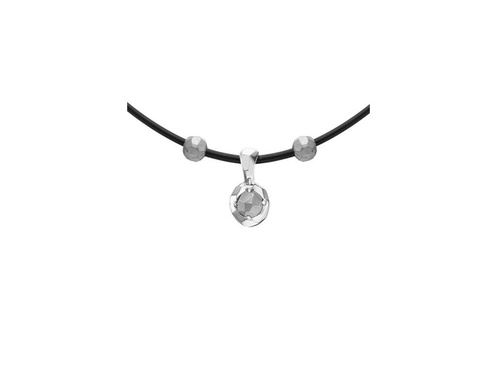 Originální náhrdelník z bílého 14karátového zlata s kaučukem. Centrální zlatá kulička je tvarována do jemných plošek a usazena v hladké, lesklé mističce, která vytváří kontrast k surovější podobě zlata. Zlaté kuličky na kaučuku jemně doplňují celkovou kompozici. Povrchové struktury zvýrazňují přirozený charakter zlata i autenticitu řemeslného zpracování.