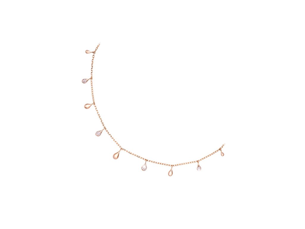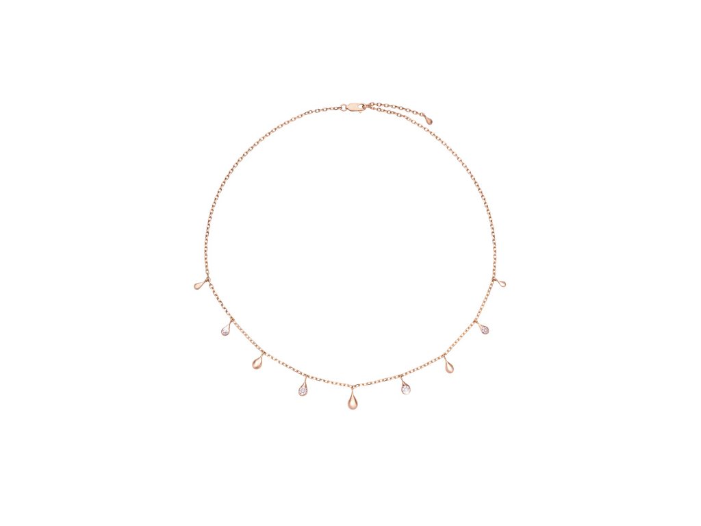 Drobné přívěsky ve tvaru kapiček zdobí náhrdelník z růžového 14karátového zlata, které se při každém pohybu jemně pohupují a dodávají šperku jemný, přirozený lesk.