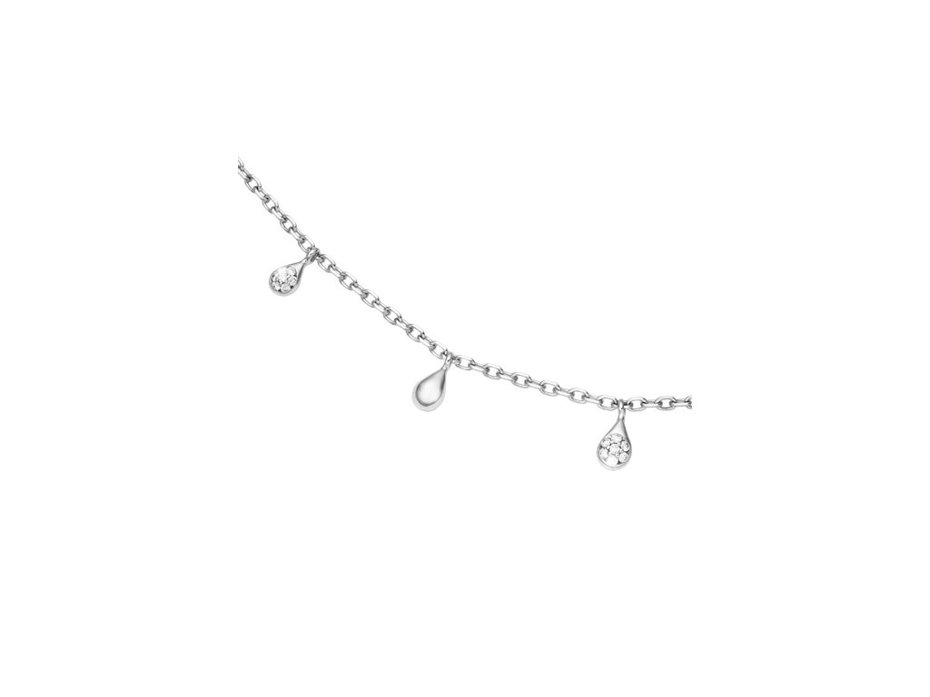 Jemný řetízek je zdoben přívěsky ve tvaru kapky, které se při pohybu lehce pohupují a zachycují světlo s přirozenou elegancí.