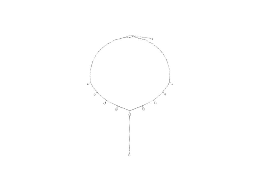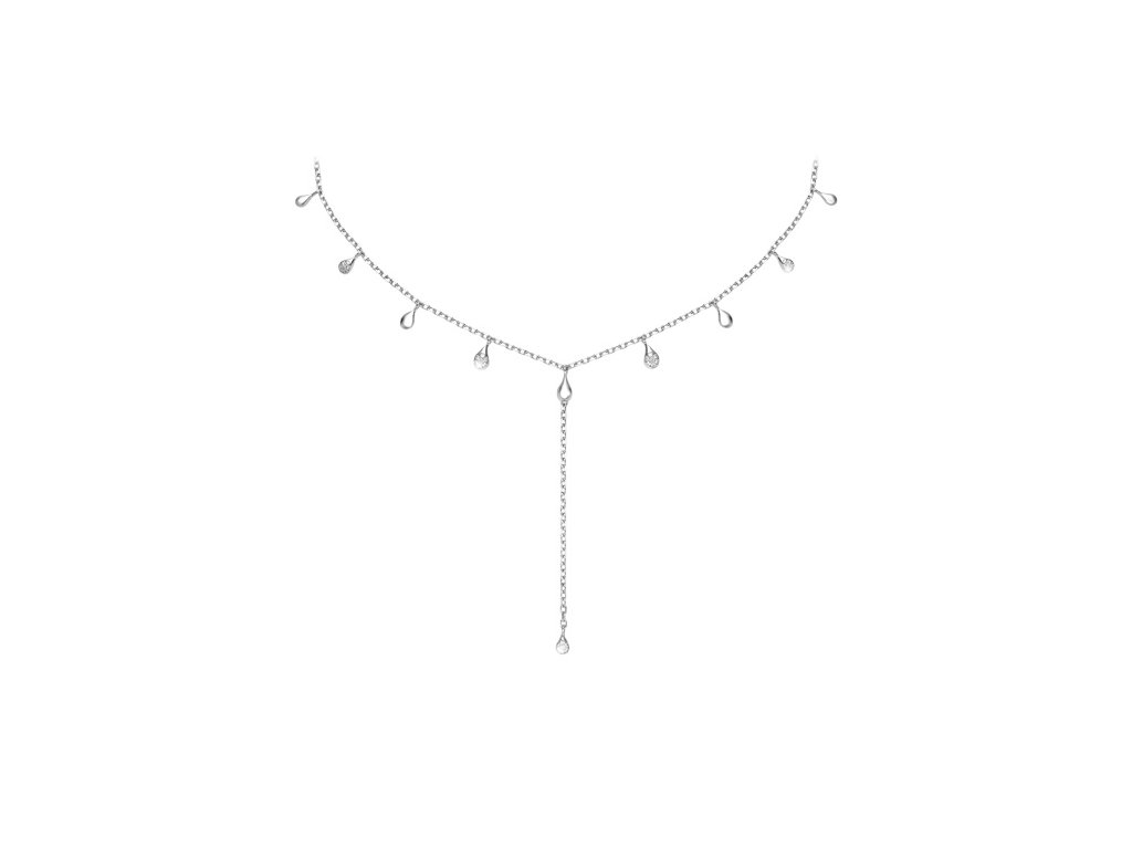 Uprostřed náhrdelníku se delší řetízek s kapičkou ladně spouští na dekolt a dodává celku smyslný detail. Některé kapičky jsou osazené brilianty, které dodávají šperku zářivý třpyt a noblesní charakter.