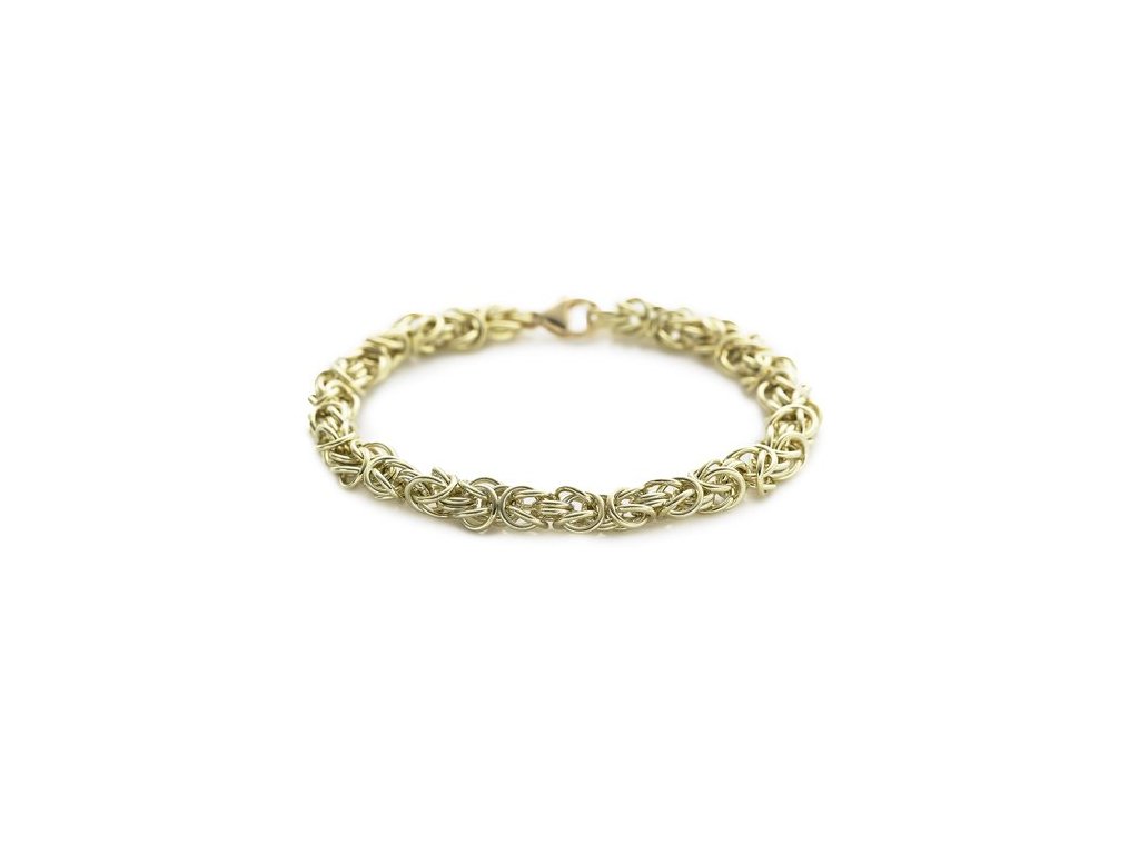 Královský náramek ze žlutého 14karátového zlata je tvořen složitě proplétanými články, které vytvářejí pravidelný vzor. Velmi pevná vazba zajišťuje odolnost a dlouhou životnost šperku. Ruční výroba podtrhuje jeho řemeslnou hodnotu, precizní zpracování a tradiční zlatnické řemeslo.
