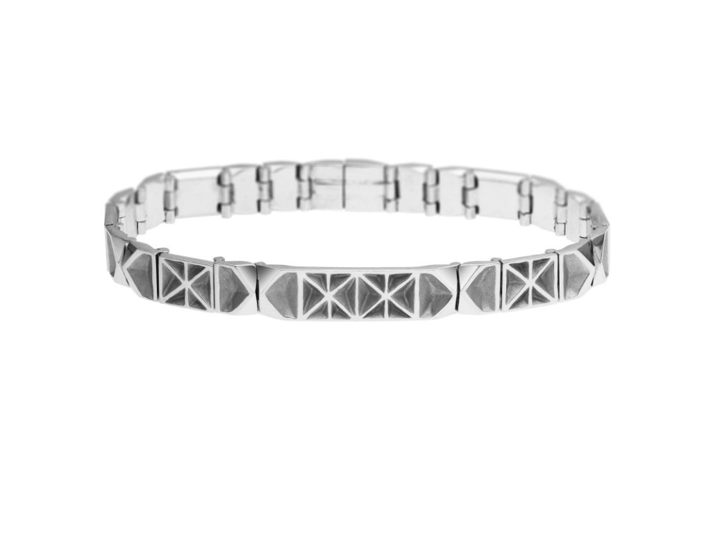 Náramek z bílého 14karátového zlata v geometrickém designu tvoří obdélníkové články s plastickým reliéfem inspirovaným pyramidovým tvarem. Právě toto zpracování dodává šperku hloubku a jedinečný vizuální efekt. Lesklý povrch podtrhuje čisté linie a zvýrazňuje hru světla na šperku.