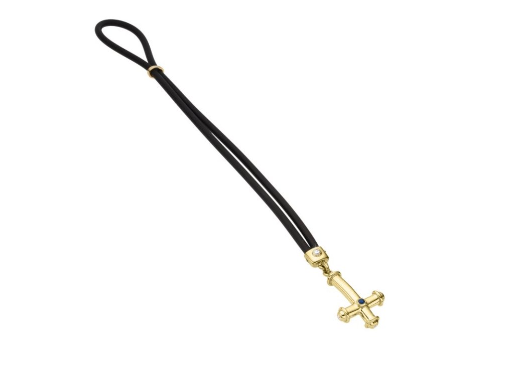 Exkluzivní náramek ze žlutého 14karátového zlata s drahokamy. Dominantou šperku je zlatý křížek zdobený modrým safírem uprostřed a přírodními brilianty zasazenými na jeho koncích. Výrazný kontrast kaučuku se zlatem a drahokamy podtrhuje originalitu náramku a dodává mu výrazný charakter.