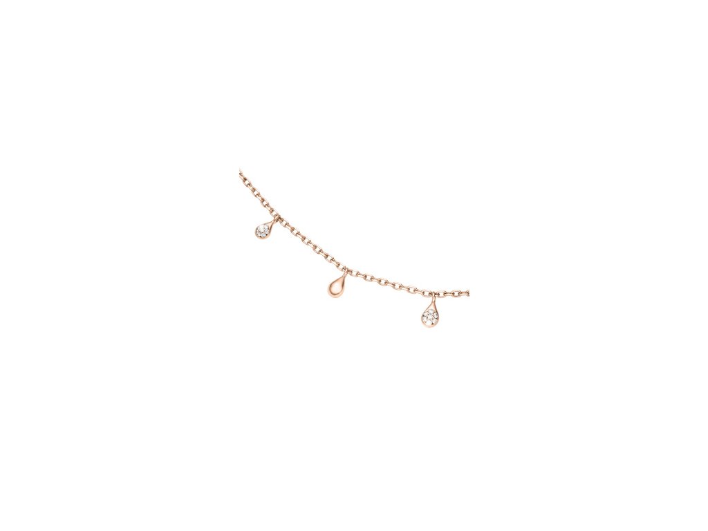 Náramek z růžového 14karátového zlata je ozdoben drobnými přívěsky ve tvaru kapiček, které se při pohybu lehce pohupují. Některé z nich jsou osazené zářivými brilianty, které se rozzáří jemným, přirozeným třpytem. Diamanty při každém pohybu zachytí světlo a podtrhnou jedinečnost celého šperku.