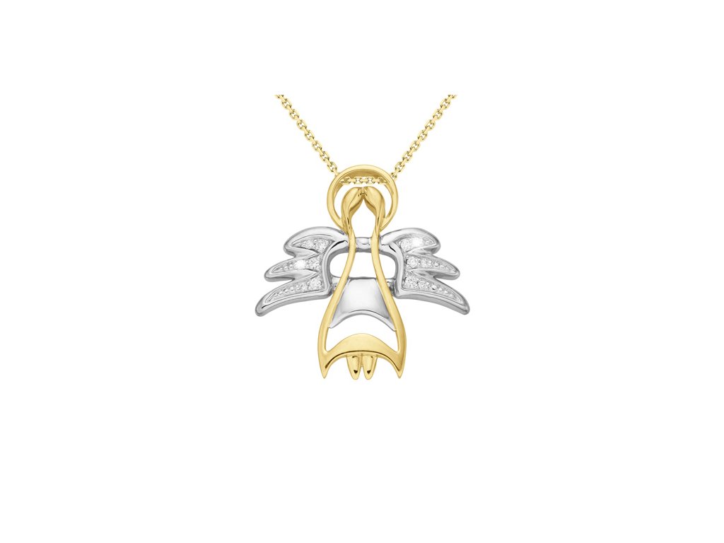 Přívěsek anděla je vytvořen z bílého a žlutého 14karátového zlata, jejich spojení vyzařuje eleganci i jemné teplo. Rozpjatá křídla z bílého zlata zdobí drobné diamanty, které jim propůjčují jiskřivý třpyt a lehkost. Anděl v sobě nese symboliku ochrany a je krásným dárkem z lásky i pro radost.