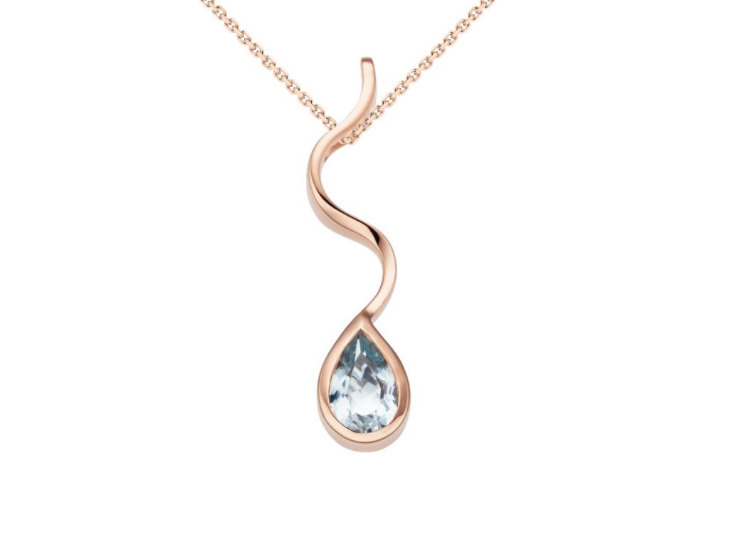 Přívěsek z růžového 14karátového zlata zdobí přírodní akvamarín ve tvaru kapky. Zlatá vlnka navazuje na jeho tvar a působí jako jemně stékající kapka vody. Světle modrý akvamarín, známý svou čistou modří, krásně září v teplém odstínu zlata a dodává šperku čistý a jasný výraz.