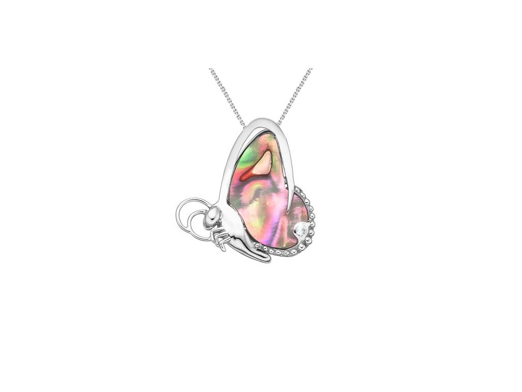 Originální přívěsek z bílého 14karátového zlata je výjimečným šperkem. Duha barevných odlesků perleti se jemně snoubí s leskem přírodního diamantu a vytváří dokonalou harmonii.