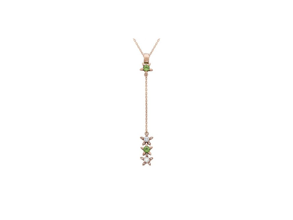 Přívěsek z růžového 14karátového zlata působí jako tanec světla a barev. Diamanty připomínající kapky jarní rosy. Pohupující se řetízek zakončený hvězdičkami rozsvítí každý váš pohyb. Jemný design s hravým šarmem vynikne při každodenním nošení i při slavnostních chvílích.