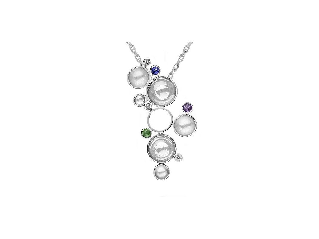 Přívěsek z bílého 14karátového zlata s přírodními drahokamy. Topaz Swiss přináší svěží modrý tón, tanzanit dodává jemnou fialovou hloubku a peridot vnáší do kompozice živou zelenou jiskru. Briliant šperk rozzáří čistým třpytem a zvýrazní každý jeho detail. Kruhové motivy krásně zachycují světlo, jemně se lesknou a svou kompozicí připomínají měsíční krátery, což přívěsku dodává originální a velmi osobitý nádech.