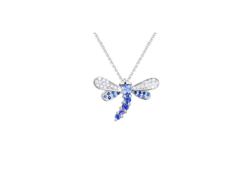 Přívěsek z bílého 14karátového zlata v podobě vážky s křídly posázenými třpytivými diamanty, se jemně usadí na vašem dekoltu. Každý váš pohyb rozzáří světlo odrážející se od safírů a vy tak budete mít pocit, že nosíte kousek přírody stále s sebou. Tento přívěsek není jen ozdobou je symbolem lehkosti, svobody a ženské elegance.