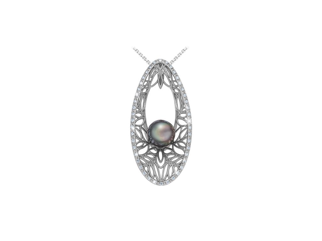 Na jeho vzdušné konstrukci se jemně třpytí linie přírodních briliantů, které obklopují vzácnou tahitskou perlu.
