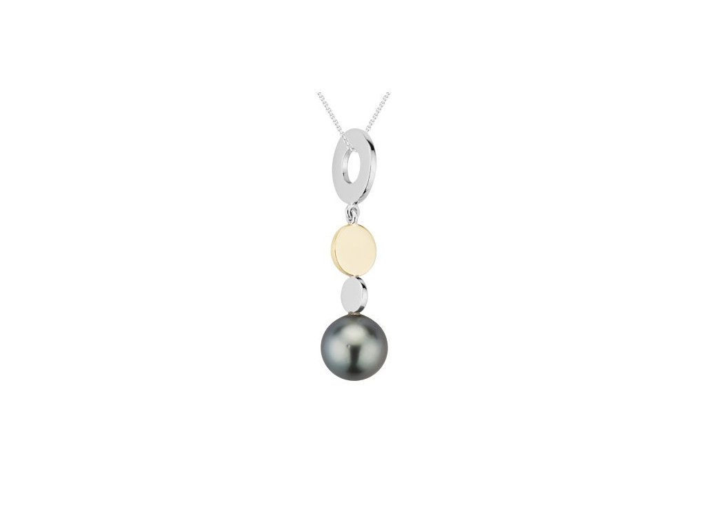Jemný přívěsek z bílého a žlutého 14karátového zlata s tahitskou perlou. Mořská perla s jemnými kovovými odlesky se při nošení lehce pohybuje a zachycuje světlo, čímž šperku dodává živý, proměnlivý výraz.