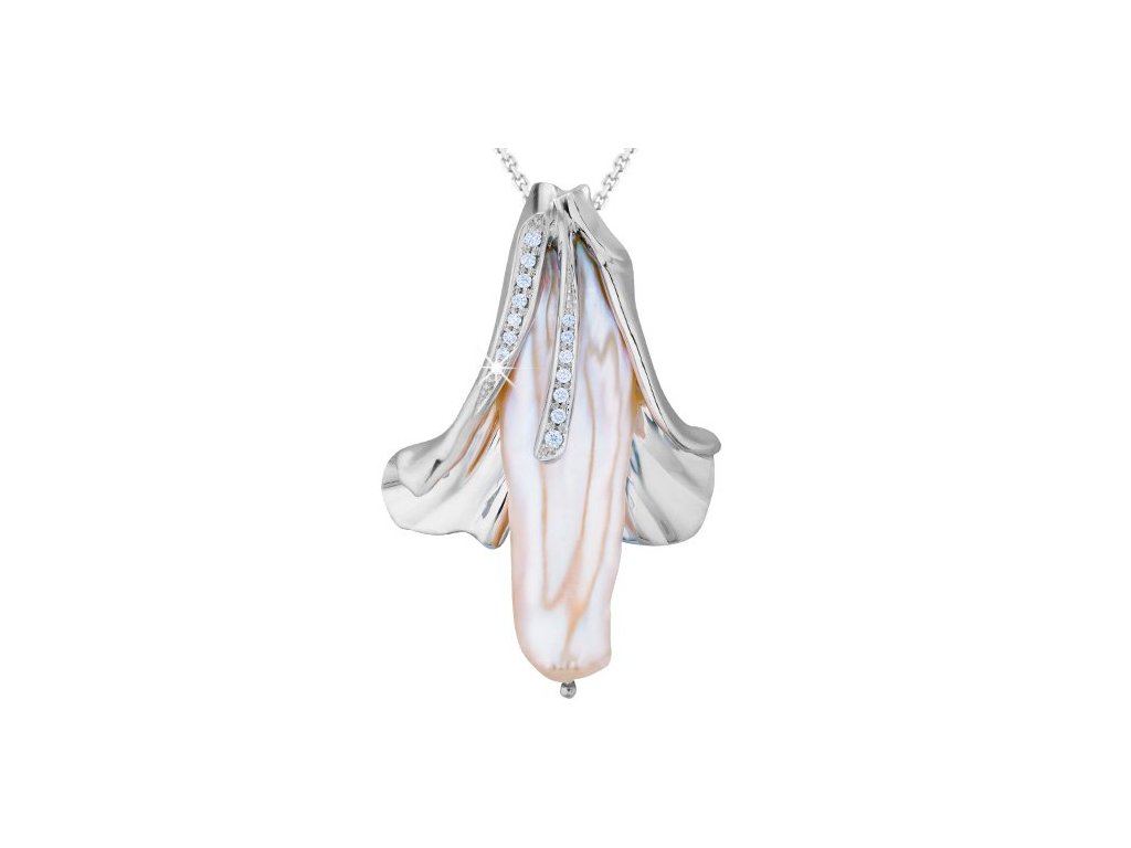 Přívěsek z bílého 14karátového zlata s přírodní perlou biwa je originálním šperkem, který spojuje přirozenou krásu a noblesní zpracování. Růžově laděná perla je obklopena jemným zlatým rámováním, do něhož jsou vsazeny čiré brilianty, které podtrhují její jedinečný půvab.
