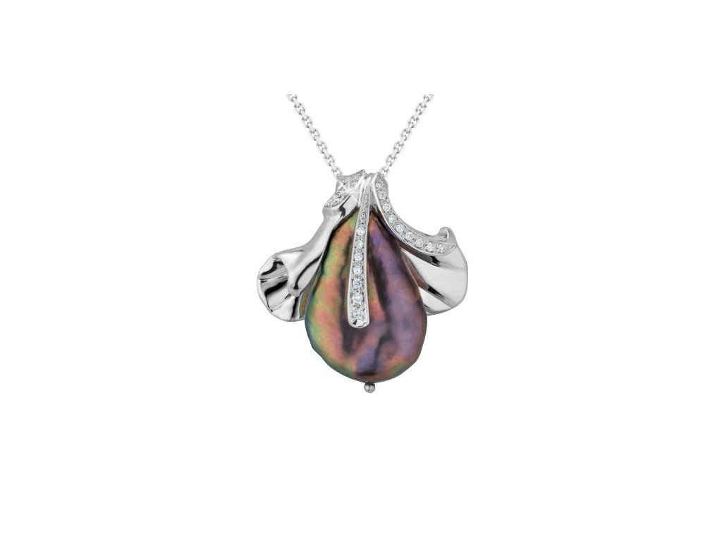 Přívěsek z bílého 14karátového zlata s přírodní duhovou perlou biwa a brilianty je šperkem, který v sobě spojuje noblesu a originalitu. Perla s jedinečnými odlesky je objímána jemnými liniemi zlata posetými třpytem diamantů. Elegantní šperk, který podtrhne výjimečnost své nositelky.