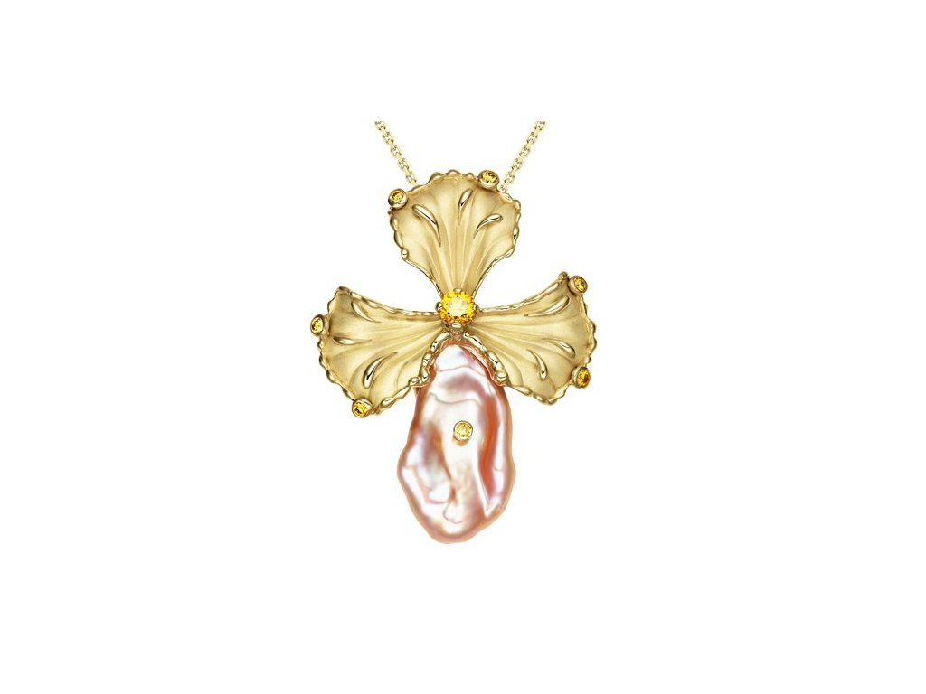 Originální přívěsek ze žlutého 14karátového zlata v podobě květu je ručně osazen zářivými žlutými brilianty, které mu dodávají sluneční třpyt. Jeho srdcem je vzácná růžová perla biwa, jejíž nepravidelný tvar odráží krásu přírody v její jedinečnosti. Do samotné perly je vsazen malý diamant, který zdůrazňuje její krásu a přirozený lesk.