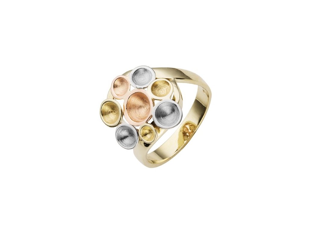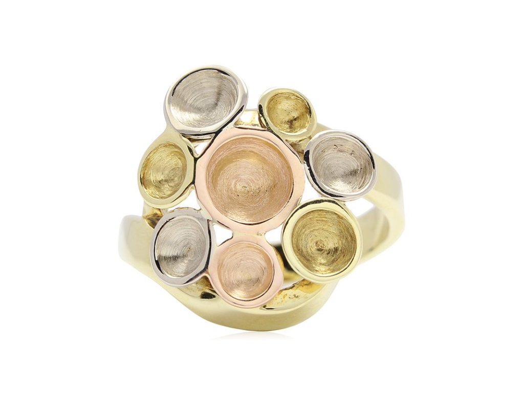 Prsten z bílého, žlutého a růžového 14karátového zlata zaujme kompozicí malých mističek, které se skládají do harmonického celku. Jejich různě velké tvary vytvářejí jemnou strukturu připomínající měsíční krajinu s jejími prohlubněmi, světlem a měkkými stíny.