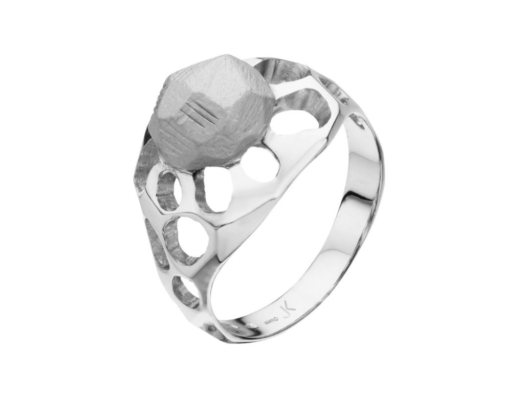 Prsten z bílého 14karátového zlata zaujme otevřenou strukturou tvořenou nepravidelnými organickými otvory. Zlatá kulička je tvarovaná do jemných plošek, které ponechávají zlato v jeho přirozené, surovější podobě. Plasticky tvarovaný povrch pracuje se světlem a vytváří jemnou hru odlesků, která podtrhuje lehkost a sochařské pojetí šperku.