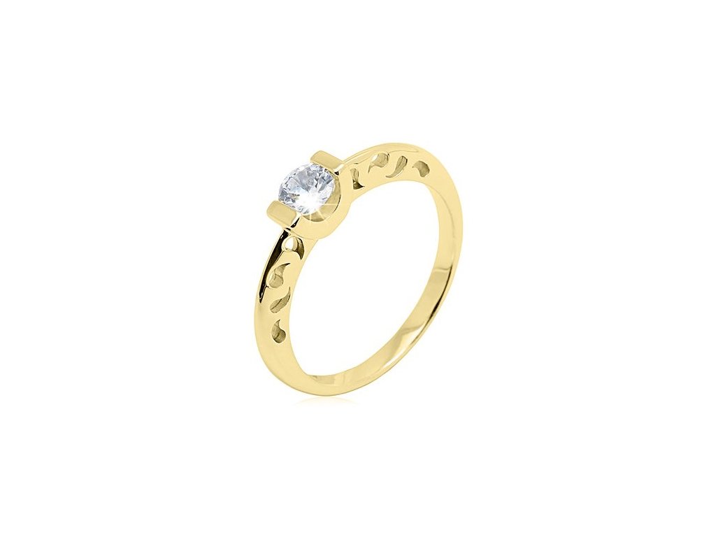 Tento prsten ze 14karátového žlutého zlata s přírodním diamantem zaujme teplým odstínem kovu a detailním gravírováním, které vytváří harmonický a nadčasový celek.
