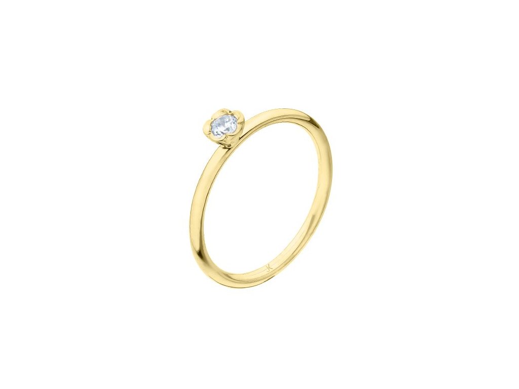 Minimalistický prsten ze žlutého 14karátového zlata s jemným motivem kytičky a přírodním diamantem je něžným symbolem ženskosti a přirozené krásy.
