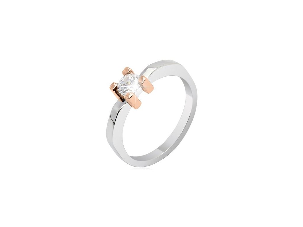 Zásnubní prsten z bílého a růžového 14karátového zlata. Prsten v sobě nese harmonii mezi klasickou krásou drahého kamene a novodobým designem, který si zamilujete.